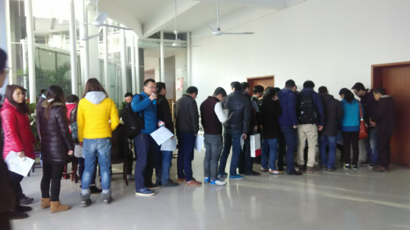 各位準備獻血的康通人井然有序地排好隊,填表、檢查、抽血!